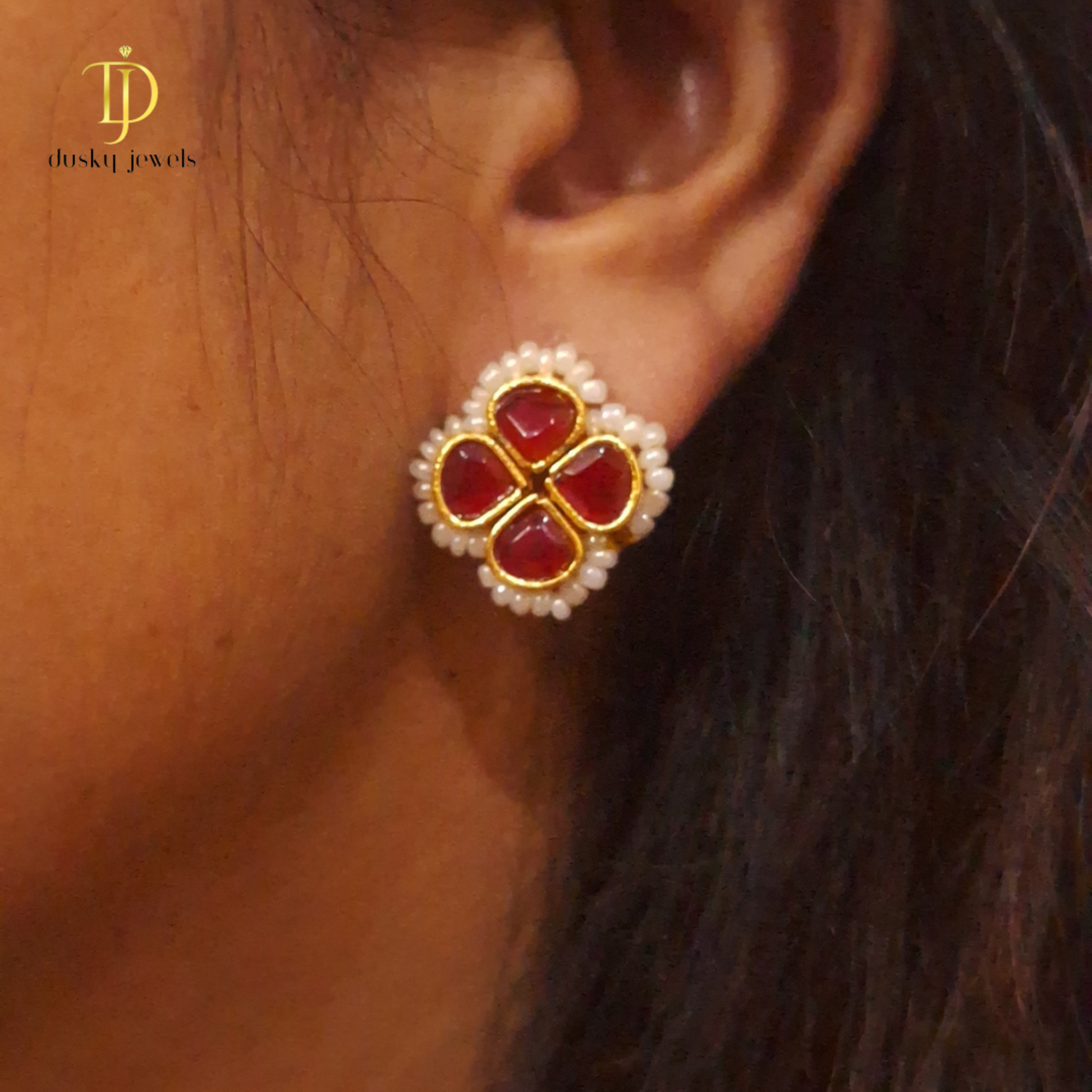 Premium Kundan Four-Petal Flower Studs - Elegant White Pearl Border Earrings